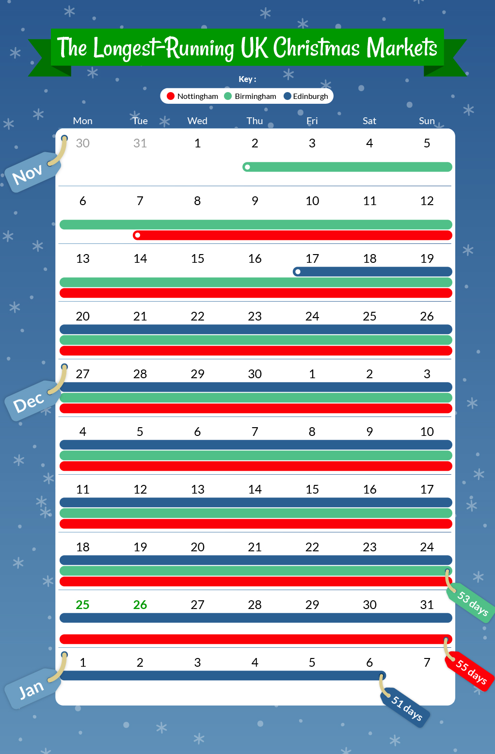 In the UK, plenty of Christmas markets run for over a month. Nottingham Christmas market runs for 55 days!