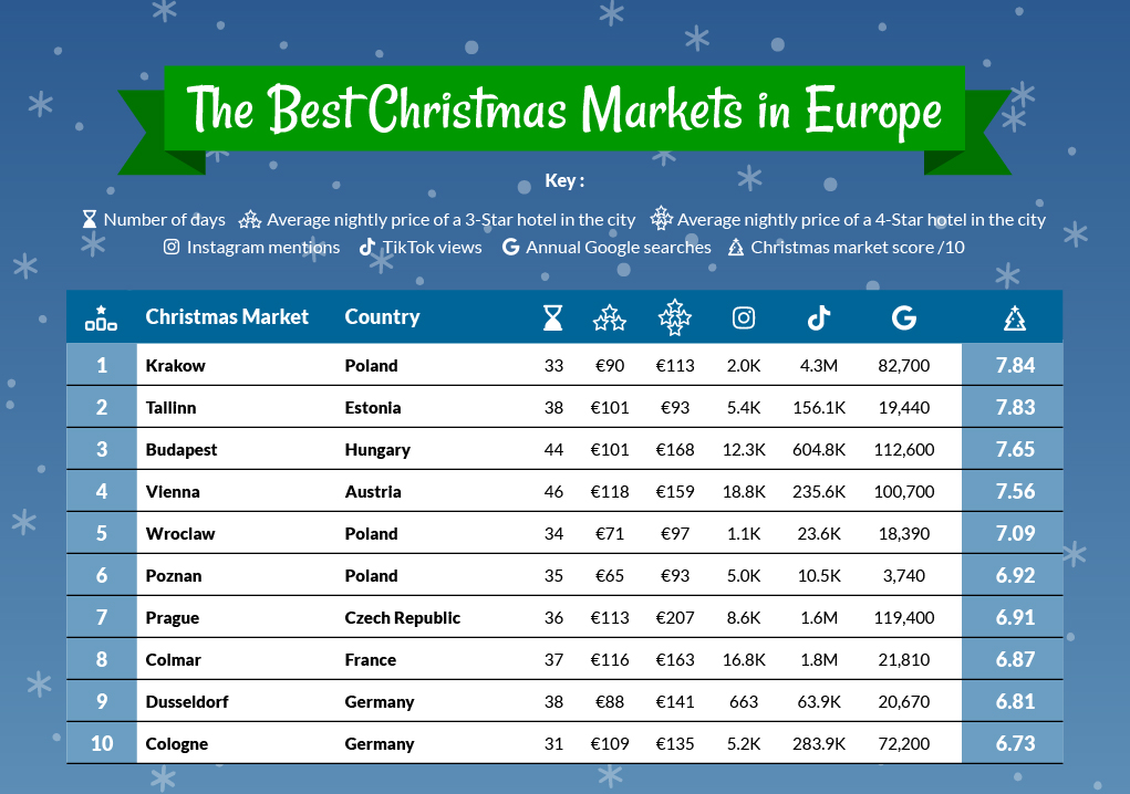 Poland’s historical city of Krakow is the best Christmas market in Europe, scoring 7.84 out of 10.